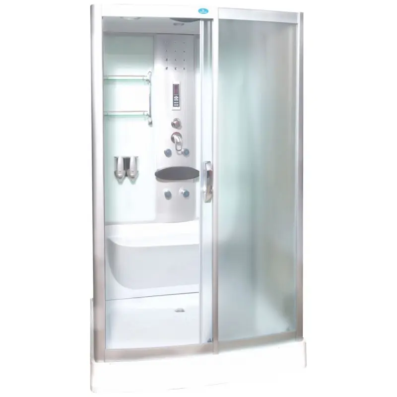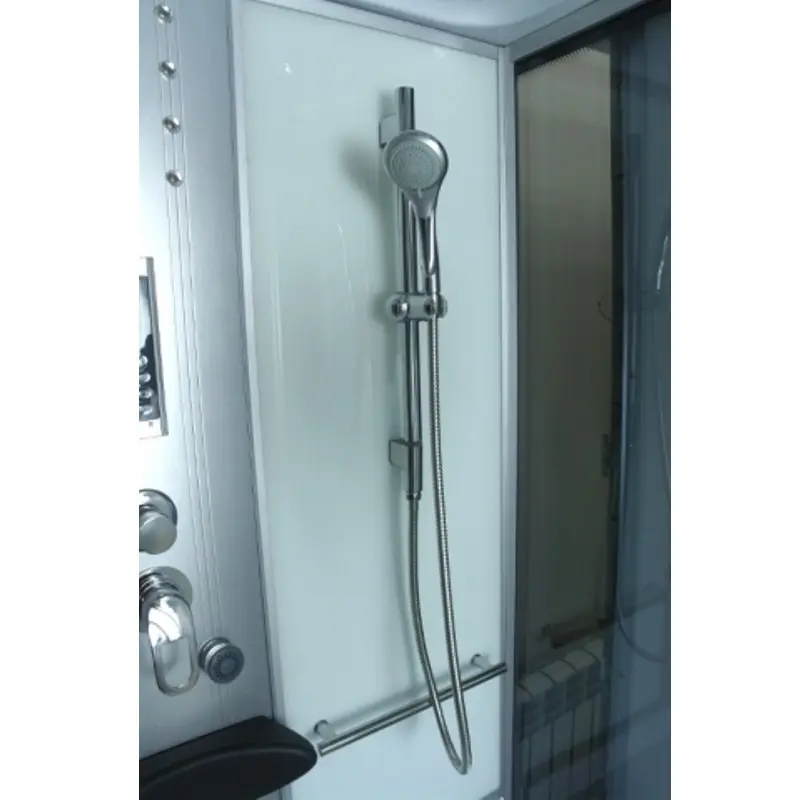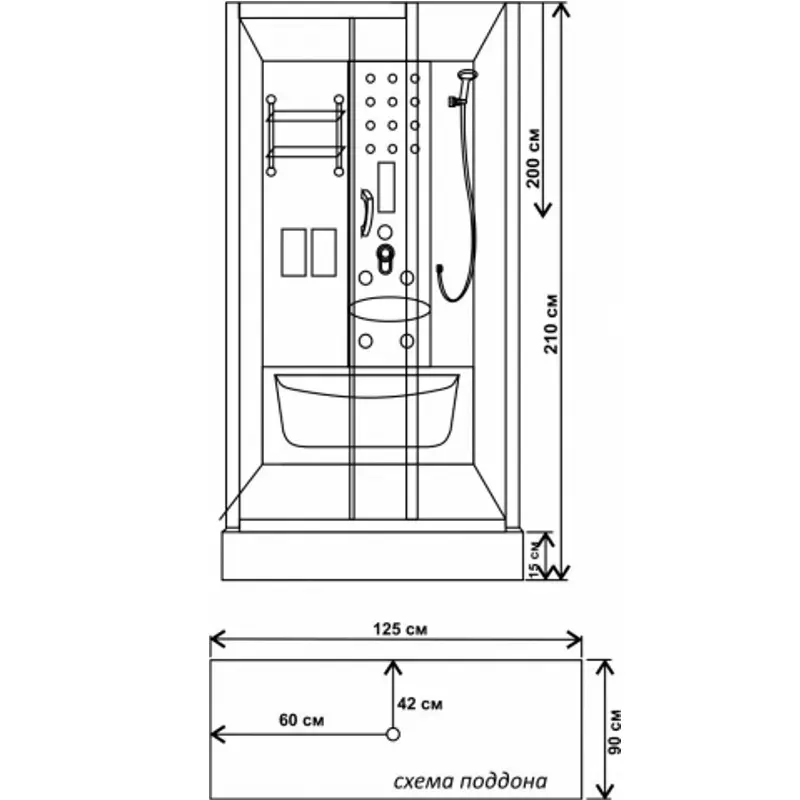 Душевая кабина Водный мир правая имеет размер 125х90 см. Форма — прямоугольная , цвет хром, исполнение полотна двери матовое. Механизм открывания раздвижной.