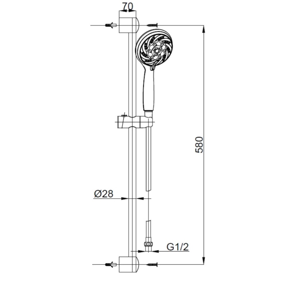 Душевой гарнитур Azario Mano имеет высоту 58 см . В комплект поставки входит душевая стойка, душевая лейка, настенное крепление, шланг для душа.
