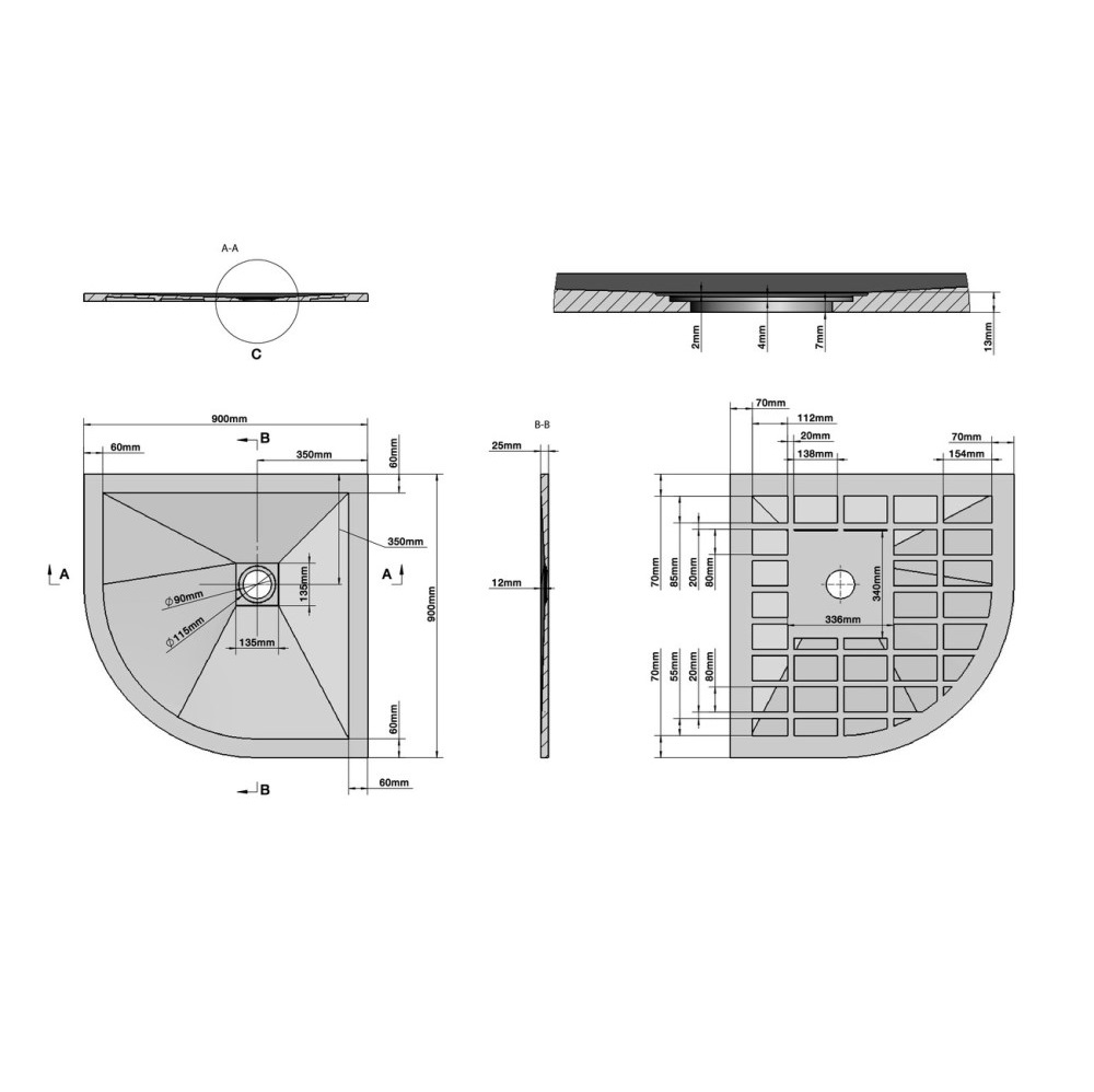 Душевой поддон Grossman Strong имеет размер 90х90 см. Форма — четверть круга, низкий, цвет поддона графит. Для установки на пол и на подиум.