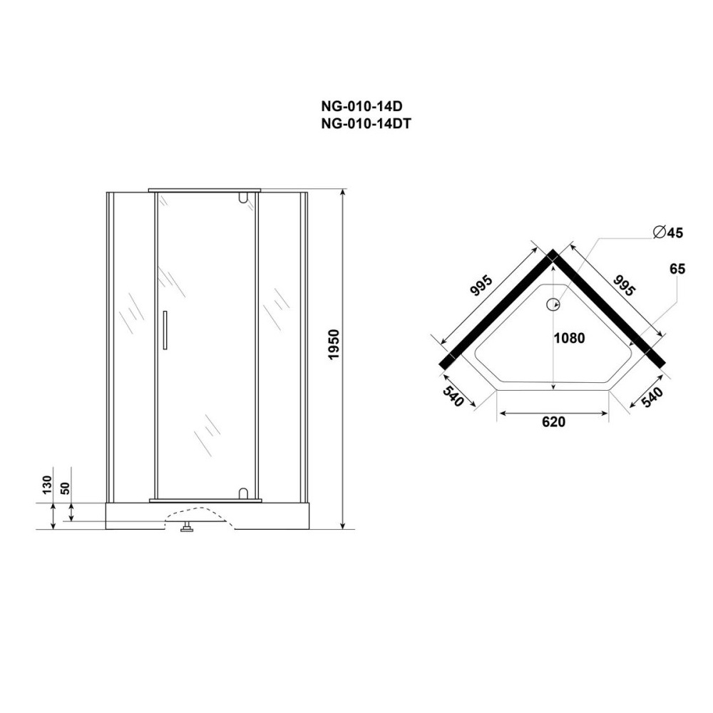 Душевой уголок Niagara Eco имеет размер 100х100х195 см. Пятиугольная форма, цвет профиля — хром, исполнение полотна двери — прозрачное. Конструкция состоит из 3 секций. Распашной механизм открывания. Устанавливается в облицованный кафелем угол ванной комнаты на поддон.