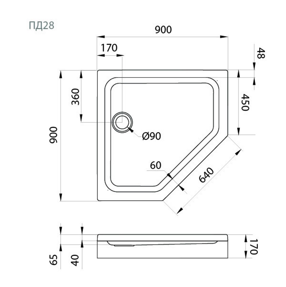 Поддон акриловый Triton ПД28 имеет размер 90х90 см, форма — пятиугольная. Поддон предназначен для установки на ножки, а также с передней декоративной панелью.