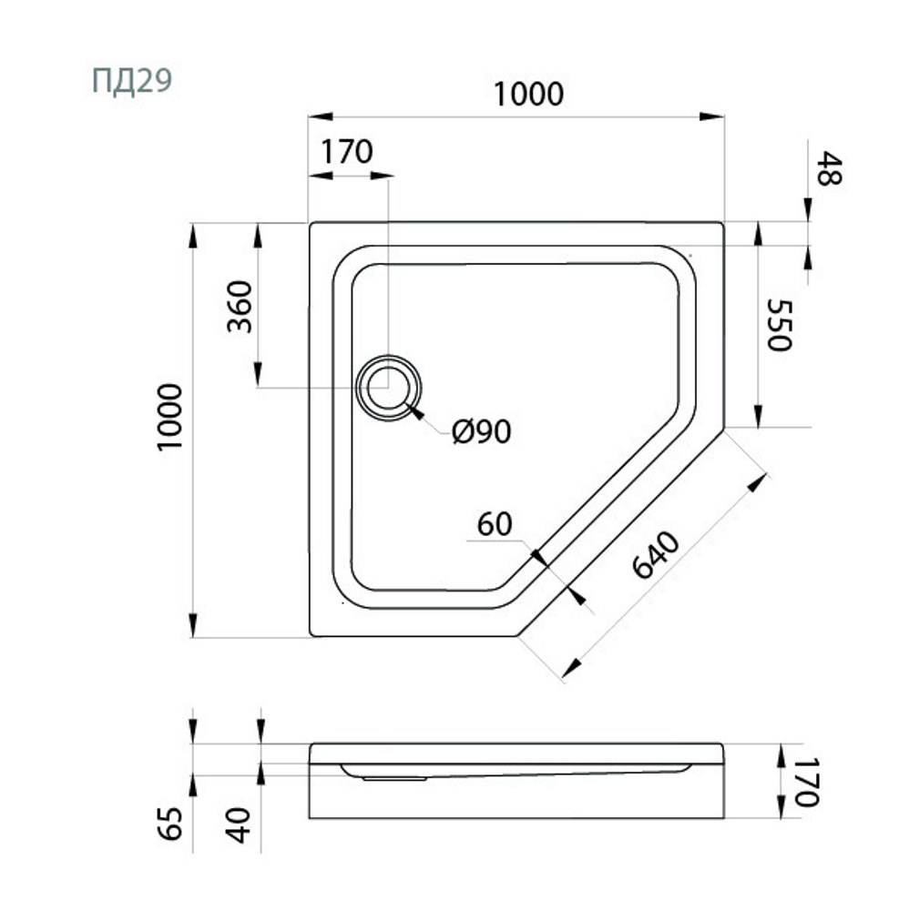 Поддон акриловый Triton ПД29 имеет размер 100х100 см, форма — пятиугольная. Поддон предназначен для установки на ножки, а также с передней декоративной панелью.