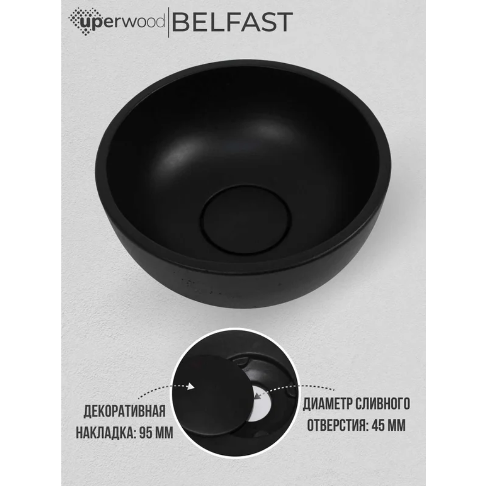 Раковина накладная Uperwood Belfast имеет размер 30х30 см. Данная модель идеальное решение для различного дизайна ванной комнаты. Дополнительно комплектуется смесителем, донным клапаном и сифоном. Сделано из бетона. Черный матовый цвет.
